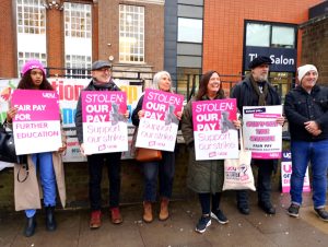 Despite heavy rain, a picket line gathered outside the Tottenham High Road site of Capital City College, with placards reading: ‘Fair pay for further education!’ and ‘Stolen our pay, support our strike!’